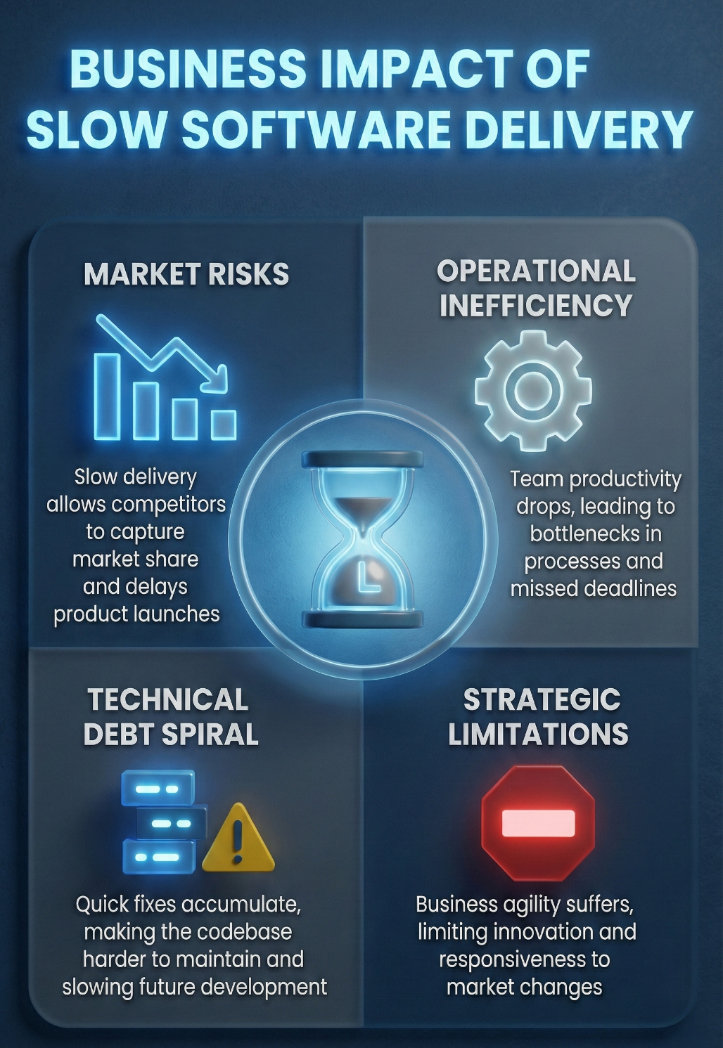 Enterprise software velocity slows down due to monolithic architectures, manual processes, siloed teams, and widening skill gaps. These result in inflating backlogs, increasing rework, and expanding release cycles from weeks into months.